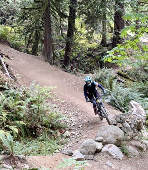 We fit in two shuttle-served rides and cobbled our way around a new trail system. Ironically, we started on a black called Cake Walk, which was anything but. It was tight, technical, and laced with rocky descents and bridge rolls at the start of Hiker Biker. I hyper-focused on not going OTB (over the bars), but snuck in glances at the valley below, featuring the ocean spilling into the bay. With Josh in the lead, we took a different route on the second run to a flowy Full Nelson and followed Psuedo-Tsuga back to the main trailhead parking lot. Gleeful to be alive after several butt-pucker sections, I was ready for a beer and to hang up my helmet for a while.