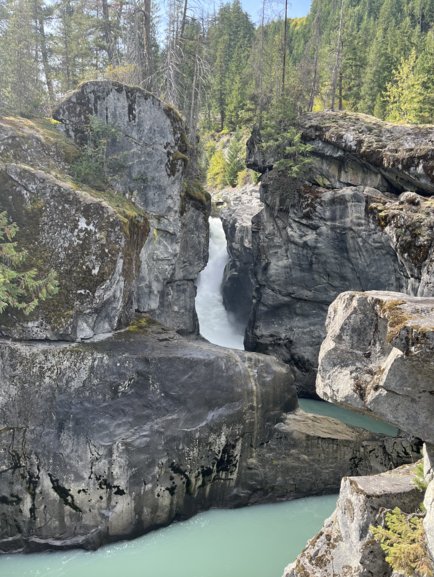 Rain and Rainbow Falls were how we started our Whistler adventures. We made the wise decision to not ride in the rain and instead hiked to nearby Rainbow Falls. We walked among astonishingly tall evergreens, huge boulders adorned with moss and mushrooms on a misty afternoon. Across a long bridge, the trail led us super close to impressive falls in a narrow valley.
