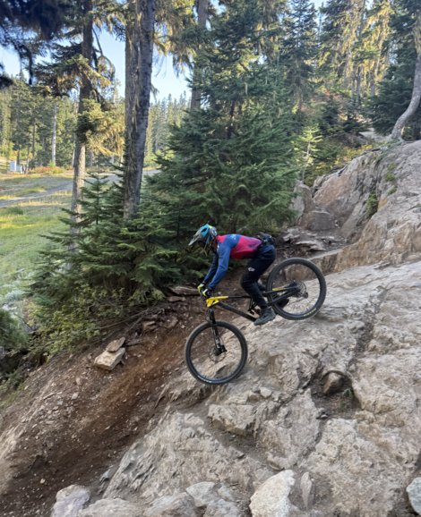 Most top-to-bottom runs are over three miles down! The cooler version of me would say, “There's tons of vert.” I'd like to confirm that downhill biking is not easy and requires standima (posting off the seat the whole time). My legs quickly tired, but I kept up as best I could with our exuberant group.