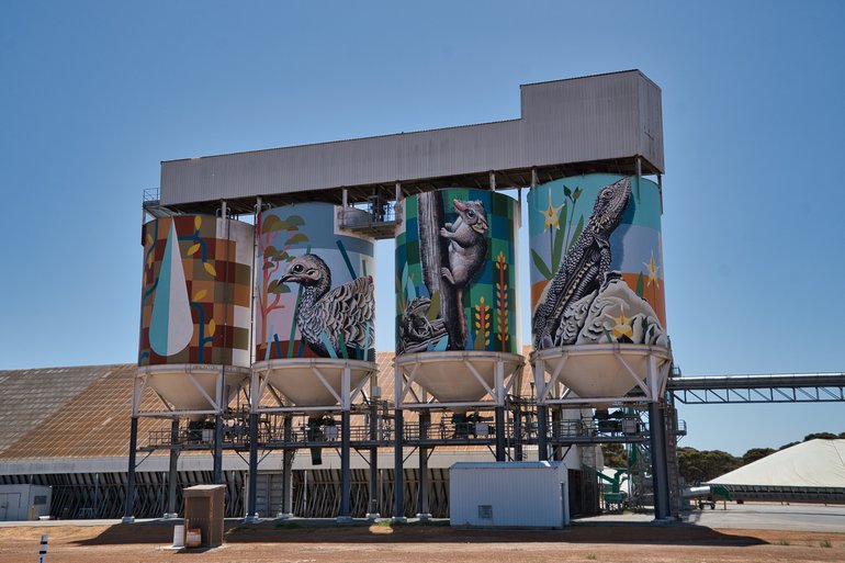 The Western Bearded Dragon, the Red Tailed Phascogale, (a rare marsupial found only in the Western Australian Wheatbelt), a malleefowl and symbolic depiction of the region, are on these four silos.