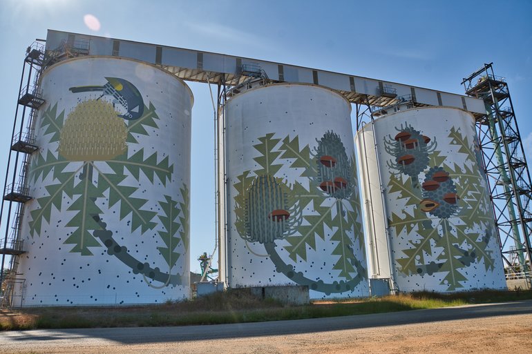 The Banksia is what you notice first on these silos painted by artist Amok Island in September 2016.