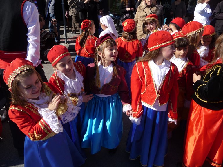 Two kinds of people live in Mytilene, those who are in the Big Parade and those who watch the Big Parade. Those who watch the big parade are the relatives of those in the big parade. We got back to the harbor road just as the Big Parade was forming up. Before the Big Parade started, the line up of marchers in the Big Parade occupied about one quarter of the road around the harbor. As we walked down the street, it became clear that the Big Parade included 1, 000 years of Greek fashions, all represented by the various participants in the Big Parade. When the parade started, some locals quickly shuffled around making space for us right at the front of the crowd lining the parade route. Although language prohibited talking with the locals, it was clear they thought it was much fun to have some foreigners joining in to watch the Big Parade. We paid them back for their hospitality by sitting town on the curb instead standing at the front of the crowd. At least that's how we hoped the locals took it. The reality was our feet were tired and we needed a sit down. But whatever, a ground level unobstructed view was just the thing for watching the Big Parade. We think it was Ochi Day also spelled Ohi Day or Oxi Day. Ochi etc is Greek for"no". Ochi Day was when Greece said "no" to joining the Axis powers in WWII, which would also help explain all the military in the parade, but to us foreigners it looked like a big historic fashion show. The Big Parade went on and on, mostly because it seemed that every school kids on Lesbos was in the parade, many wearing historic costumes, some wearing their school uniforms, but what ever, a rare treat for a tourist.