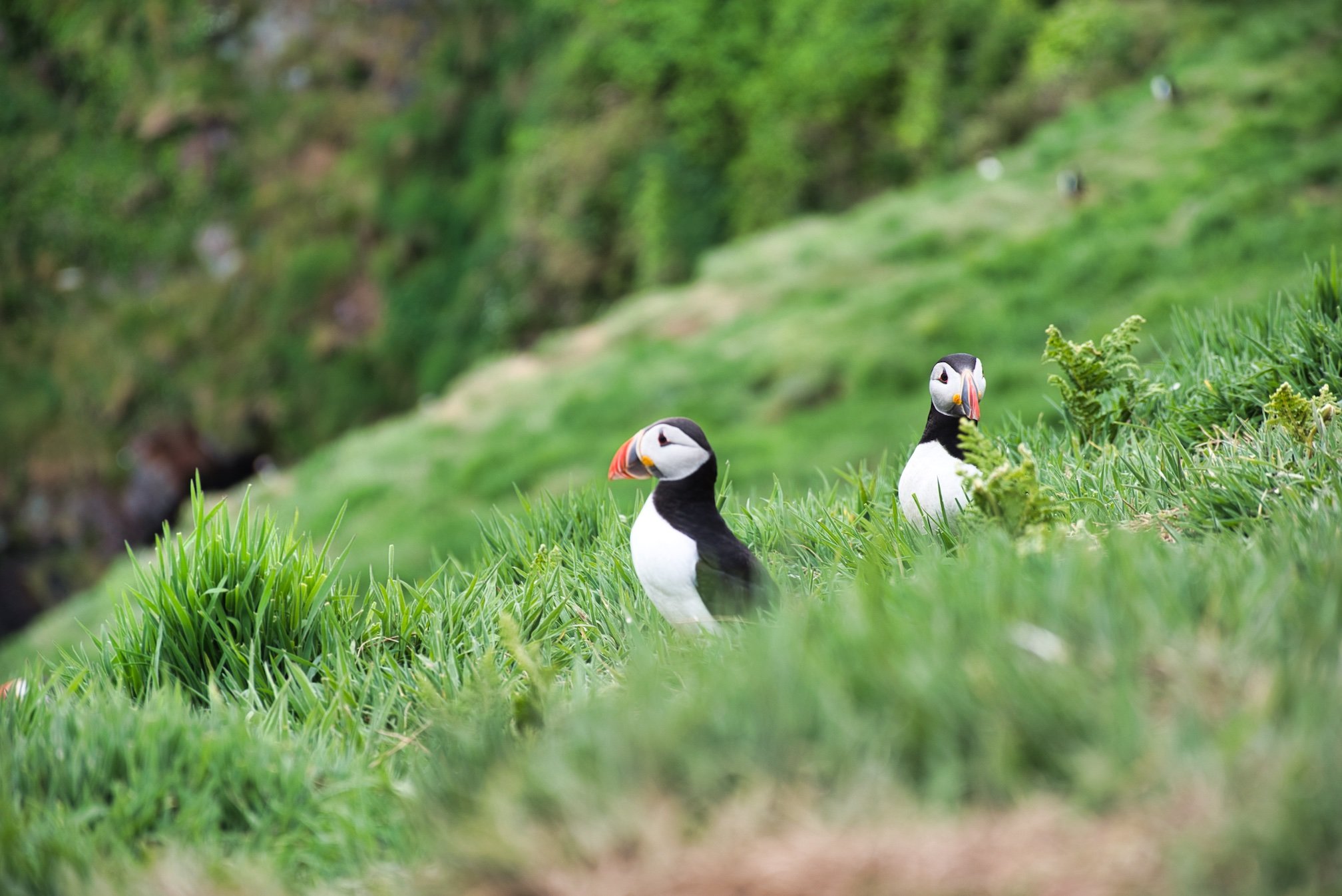 Puffins standing outside their burrows on the slopes leading back down to where the ferry came in