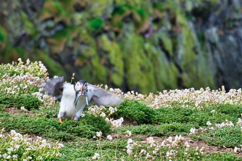 A Puffin landing with a mouthful of Sand Eels. He then runs into its burrow