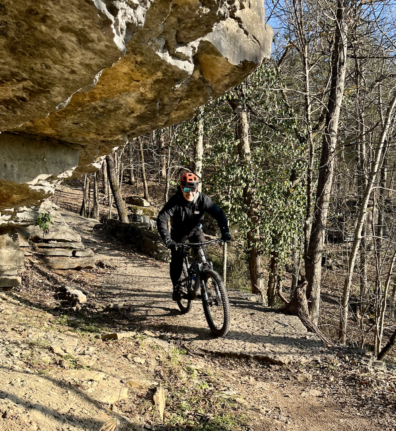 My goal is to follow the Back 40 to the new techy and narrow, It'll Bluff Out Trail, that is cut into the ridgeline of some classic Ozark ledges along HWY 71. The trail builders were nice enough to put a few guard rails on the “fall to your death” sections. Riding solo that day, I navigated cautiously, feeling a bit ledgy. Thankfully, I knew Rosita's Mexican Restaurant and Bar were right along the trail, so I could stop for a drink to calm my nerves.