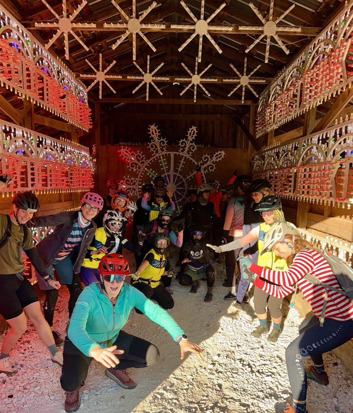 I joined the Dec. 6th Flagship ride (Blue Group 1) that met in downtown Bentonville. Sign up early, and for those who need a bike, they even have a free rental option. An impressive group of 70+ ladies showed up for some group riding and camaraderie. We split into groups according to skill level: Green, Blue, or Blue/Black. Two ride leaders manage each group with a lead and sweep. My bad-ass bike bosses for the day: Andrea led us out to Slaughter Pen with Danna sweeping; we rolled into All-American, cruising by the impressive Crystal Bridges Art Museum, then to Boo Boo and Choo Choo, then onto a roll of the Masterpiece.