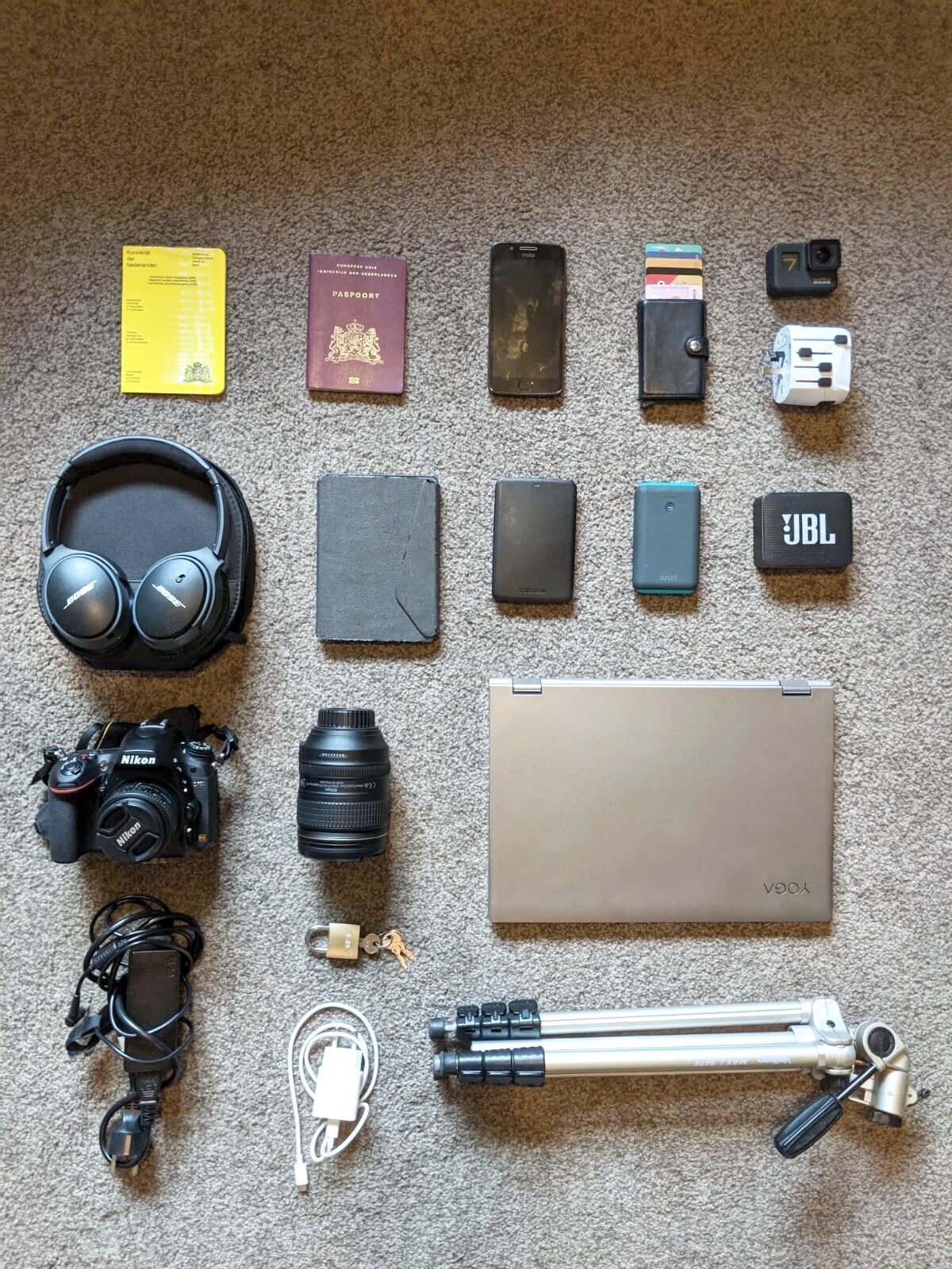 - Camera + 2 lenses + extra battery (we carry a Nikon D750 + one 50mm portrait lens and one 24-120mm all-round lens)